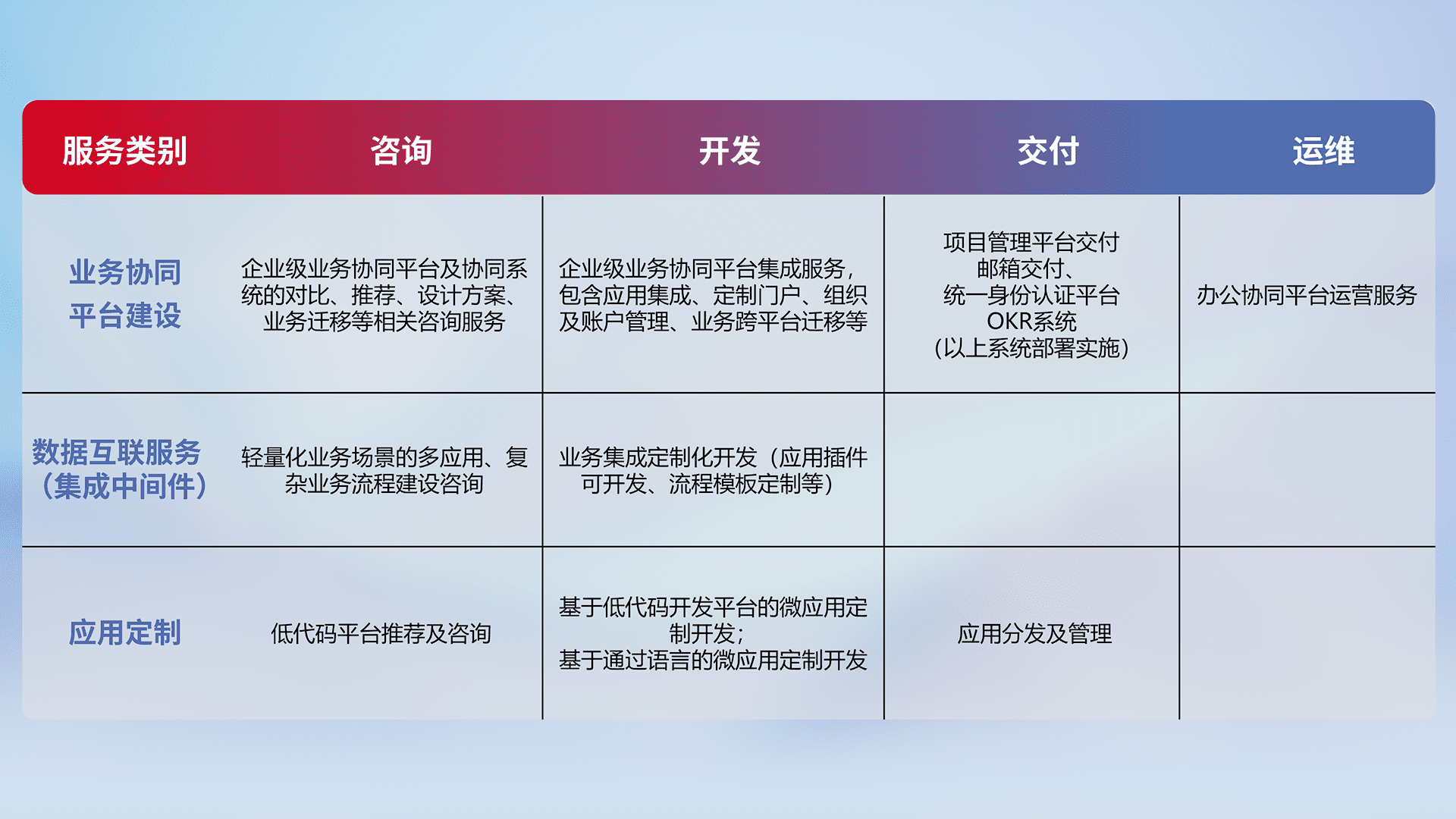 针对钉钉、、、企微、、、、IDaas等平台级产品提供产品的规划、、方案、、交付、、、定制化开发等服务,,,,实现如统一协同办公、、智能客户服务、、、、混合会议管理、、智能数据查询、、等业务场景,,,,实现数字化转型。。。。
